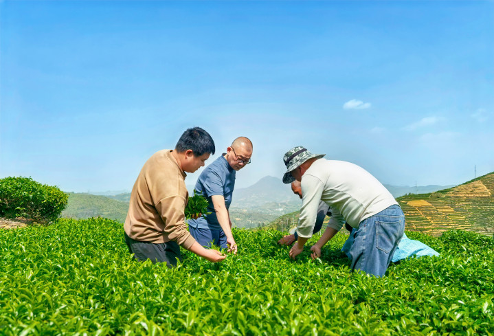 ▼江岔村驻村第一书记陈毓(左二)在高山茶园查看茶叶品质。陈郑耀摄(人民视觉)