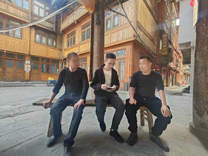 ▼肇兴村驻村第一书记徐信基(中)在肇兴侗寨鼓楼里和村民商谈产业发展。唐正尧摄(人民视觉)