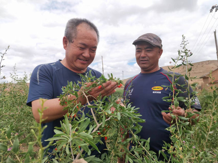 ▼枸杞采摘期,吊堡子村驻村第一书记李宗仁(左)来到枸杞地里查看枸杞产量情况。李媛媛摄(人民视觉)